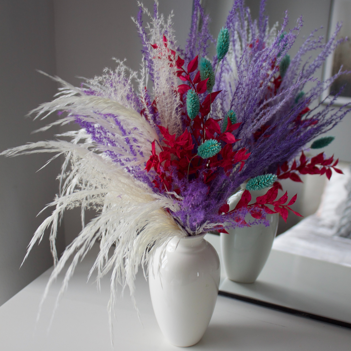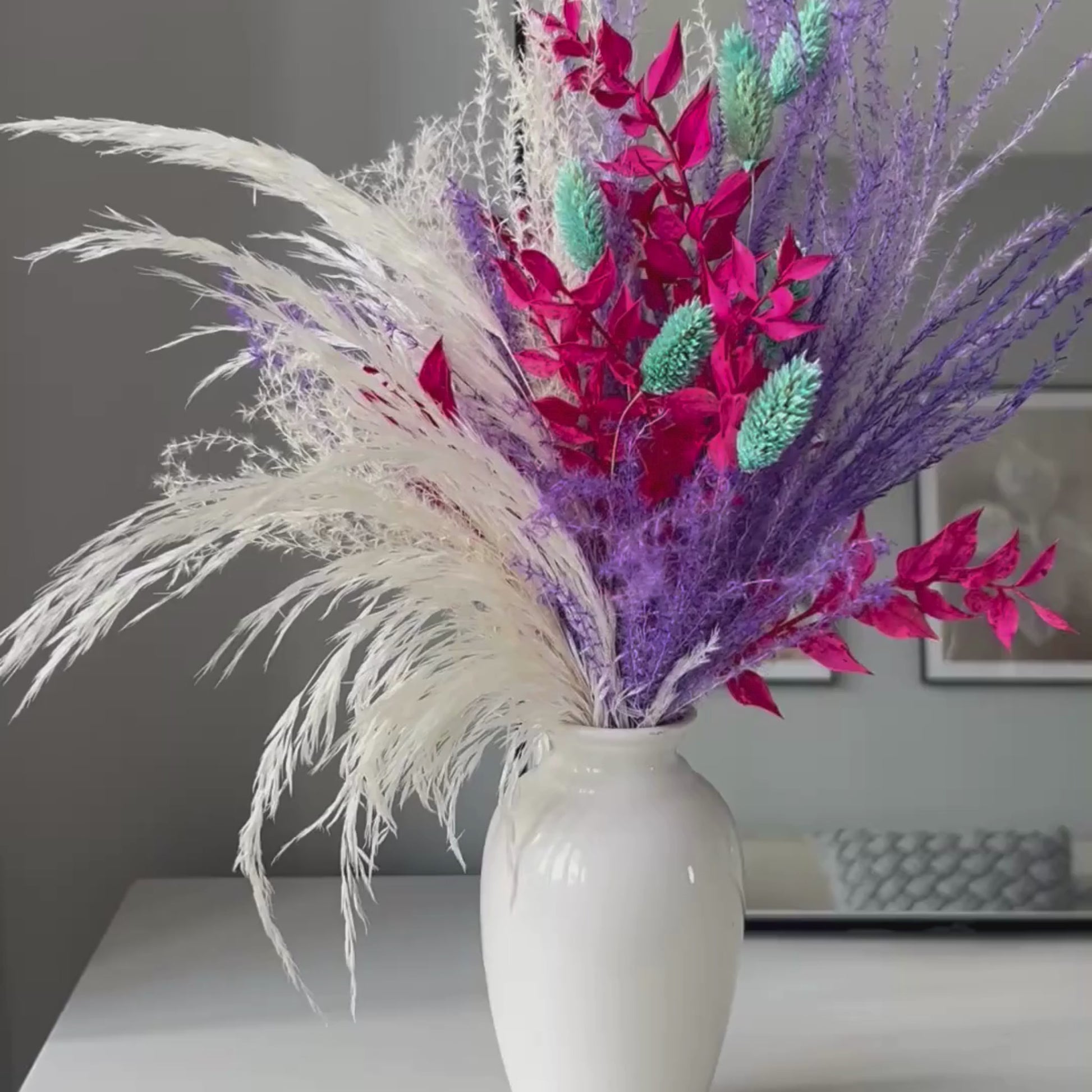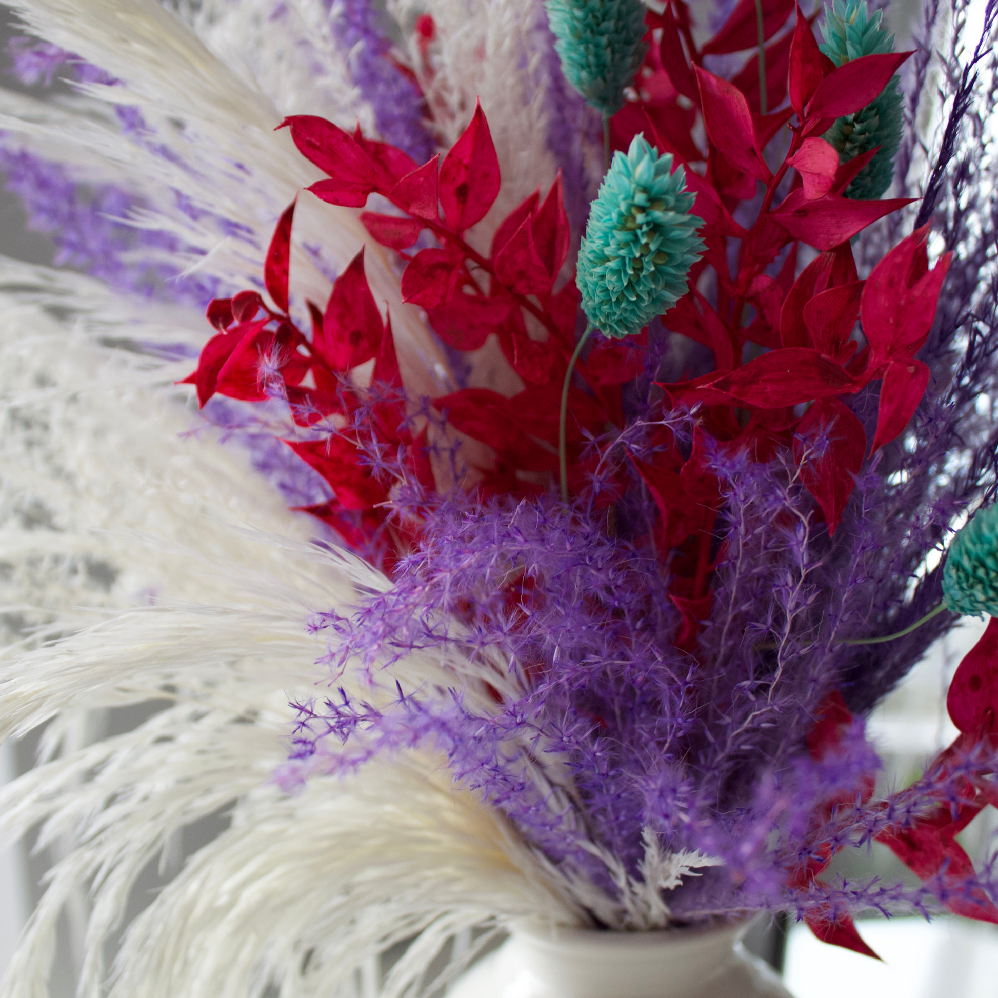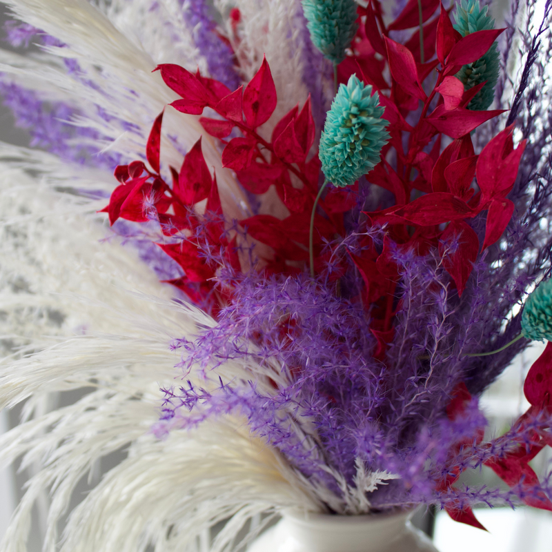 Unleash a celebration of color into your space with The Confetti Burst, a truly enchanting preserved pampas arrangement. Inspired by the joyful explosion of scattered festivities, this vibrant bouquet is a dazzling display of fluffy white pampas, lush purple plumes and playful teal accents. Lasts 1 to 3+ years.