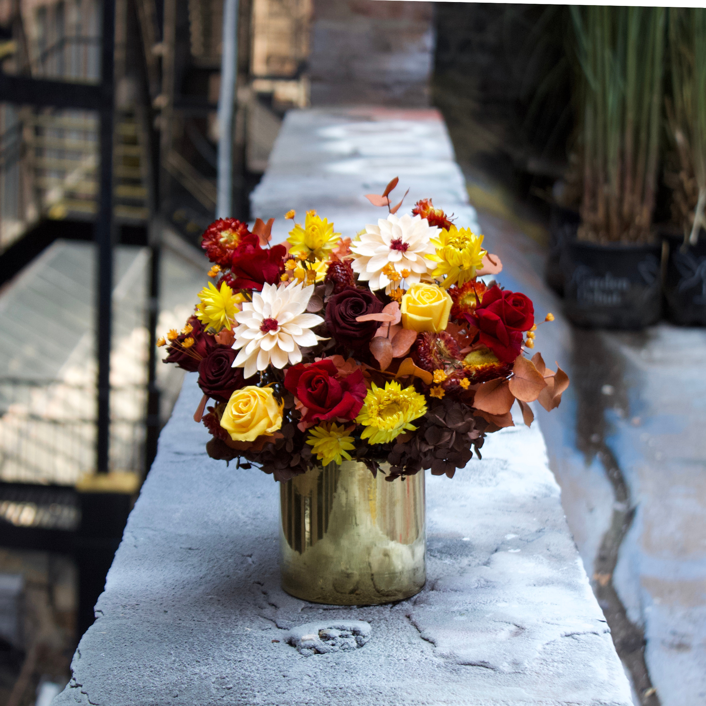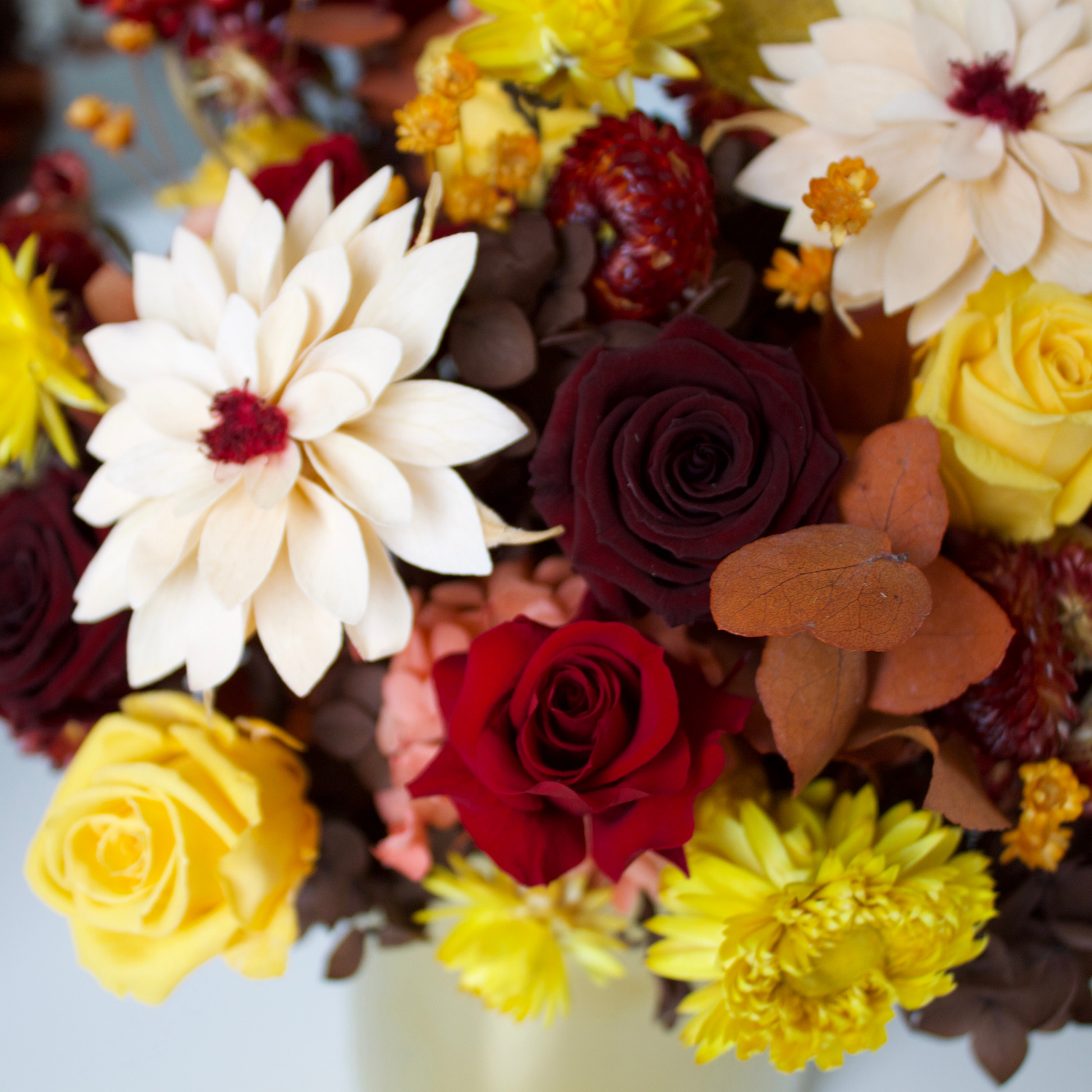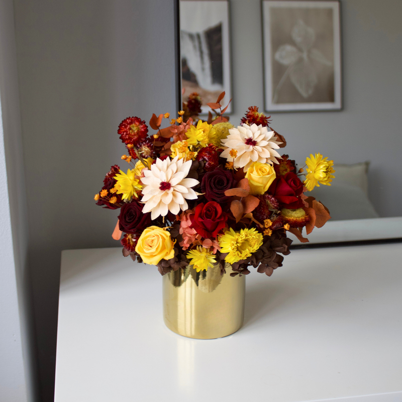 With its striking mix of deep burgundy, fiery red, and golden yellow, the Golden Hour preserved floral arrangement captures the rich and vibrant colors of the autumn season. It's a celebration of fall's best moments: the warmth of a spiced cider, the brilliant color of changing leaves, and the cozy feeling of a bonfire on a cool evening.