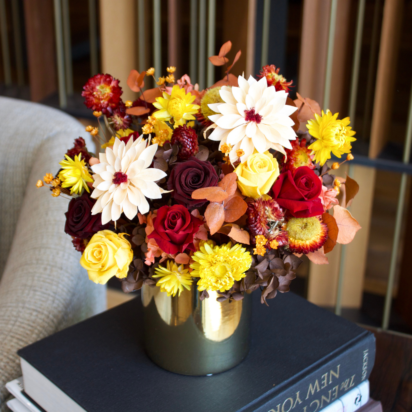 This arrangement isn't just a bouquet; it's a piece of the season. It embodies the feeling of the harvest—a time of abundance and natural beauty. The rich palette is perfect for bringing a sense of warmth and natural splendor to any space, and because these are preserved blooms, their beauty will be a lasting reminder of the season's magic. Place it on a mantel or as a centerpiece for a touch of timeless autumn charm.