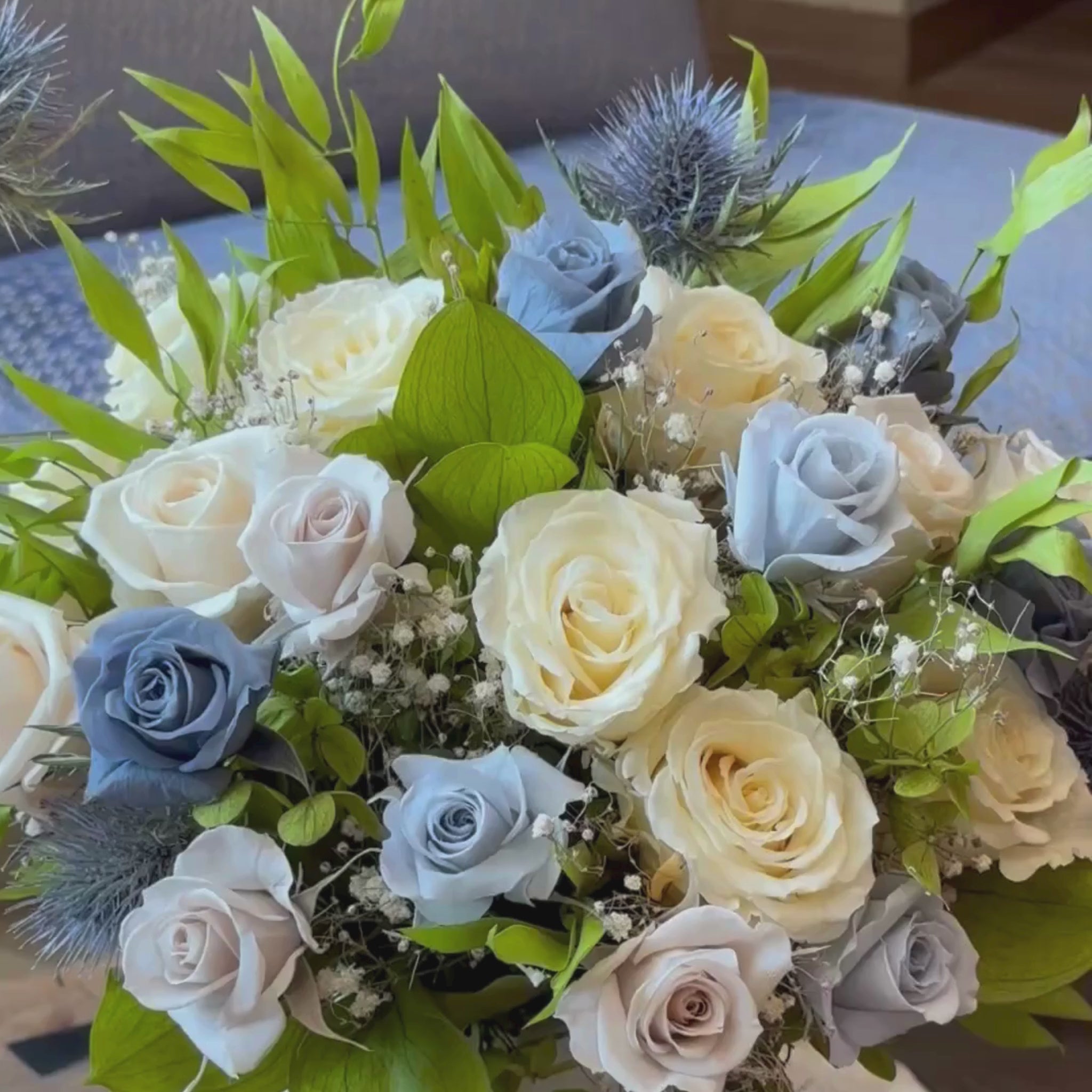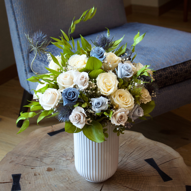 Embrace the serene beauty of The Nantucket, a reimagined version of our best selling arrangement inspired by the tranquil charm of the east coast. Delicate cream and champagne, with varying shades of dusty blue roses evoke the gentle hues of ocean spray and sandy shores. Accented with wispy green foliage and intriguing thistles that mimic sea botanicals, this arrangement brings an enduring sense of calm and sophistication to any space. Lasts 1 to 3+ years.