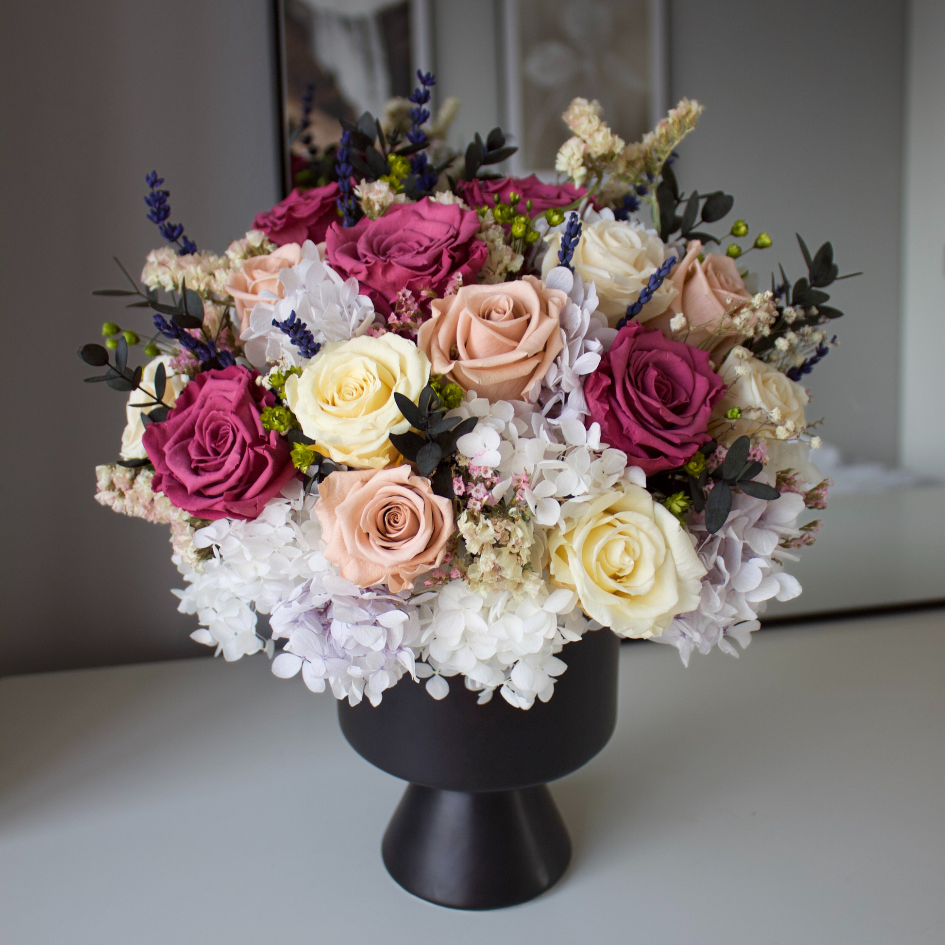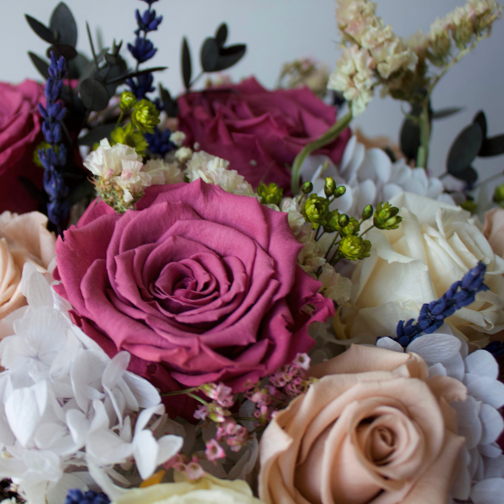 Whisk yourself away to a luxurious alpine retreat with The Après. Rich, velvety violet roses evoke a cozy fireside warmth, beautifully complemented by the soft, earthy tones of sand and creamy white roses, reminiscent of freshly fallen snow. Delicate sprigs of blue lavender and subtle hints of white and pale lavender hydrangeas complete this breathtaking blend, capturing the serene and sophisticated beauty of a snowy mountain escape, designed to last all year round. Lasts for 1 to 3+ years.