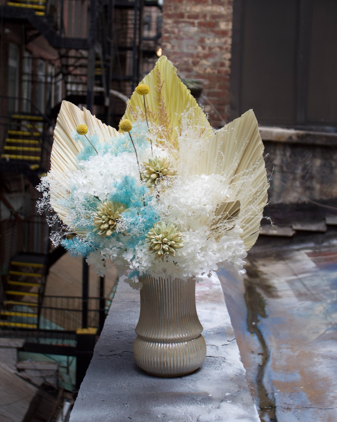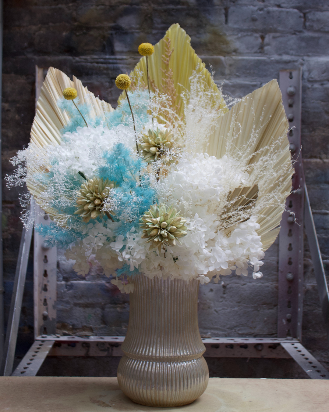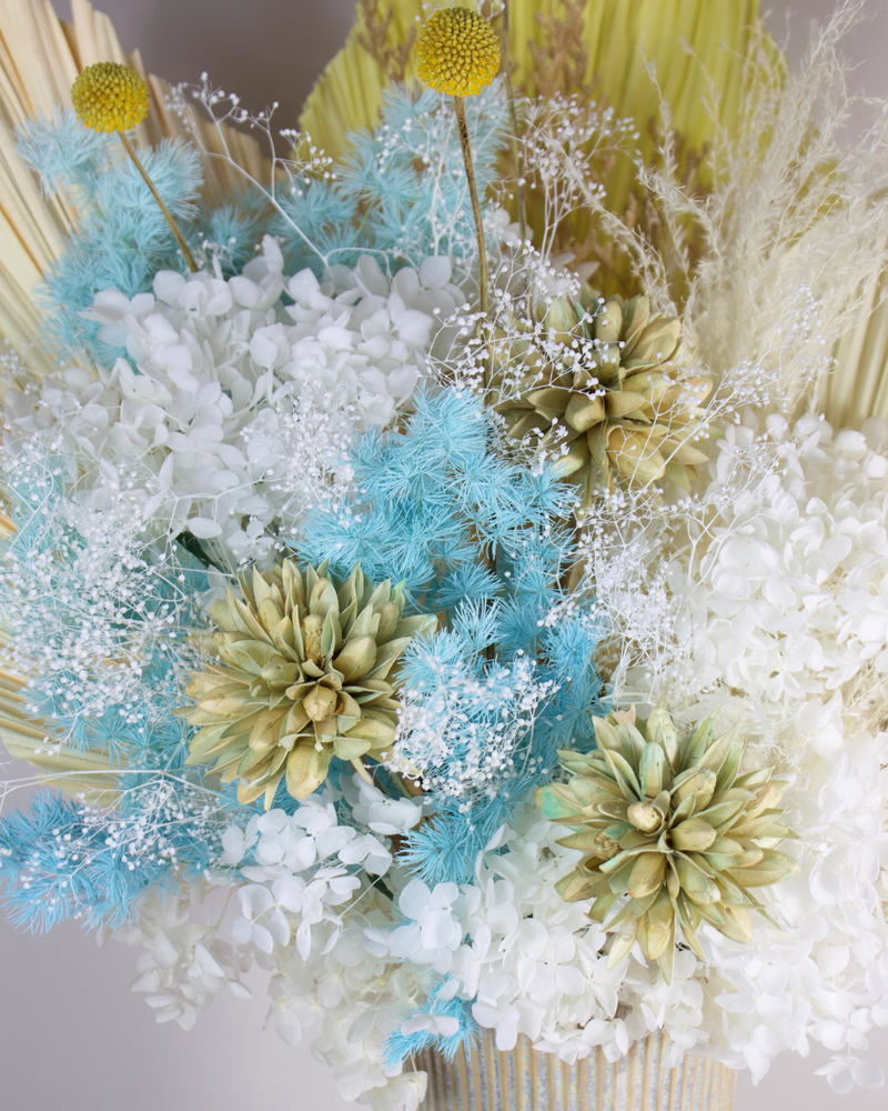 The Calypso is a breathtaking long-lasting preserved arrangement inspired by tranquil shores. Elegant, fanned palm fronds frame a captivating blend of airy white hydrangeas and delicate turquoise-blue accents, evoking pristine waters. Presented in a ribbed, champagne-toned vase, this timeless piece brings sophisticated coastal calm to any space.