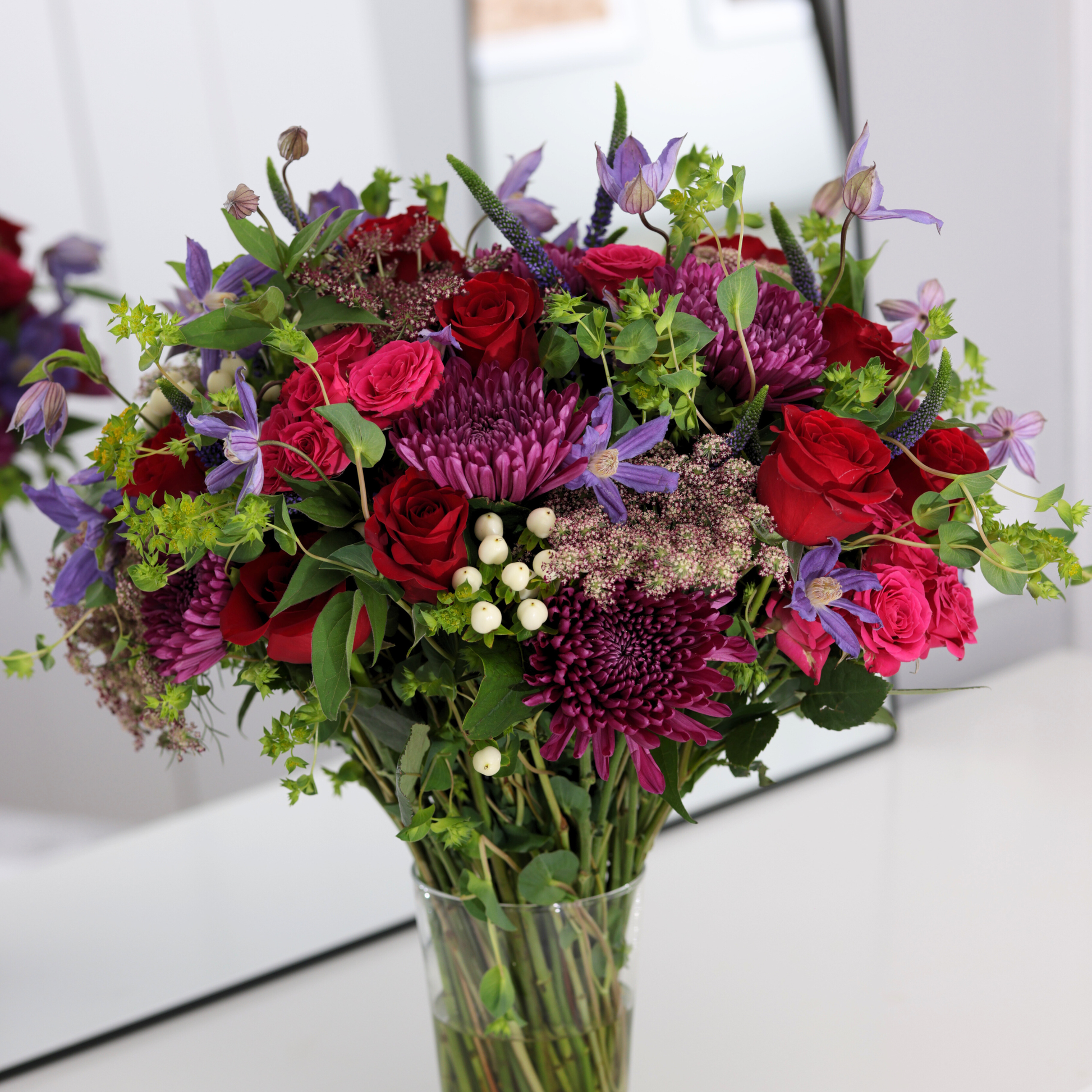 Inspired by the deep, shifting colors of a twilight sky, The Cosmos is a sophisticated exploration of texture and mood. This luxury arrangement centers on rich, velvety tones of plum and ruby-red, balanced by the electric pop of bright pink roses and the ethereal touch of lavender clematis. Layered with architectural greens, delicate white berries, and wispy, star-like accents, the design captures a sense of untamed, celestial beauty.