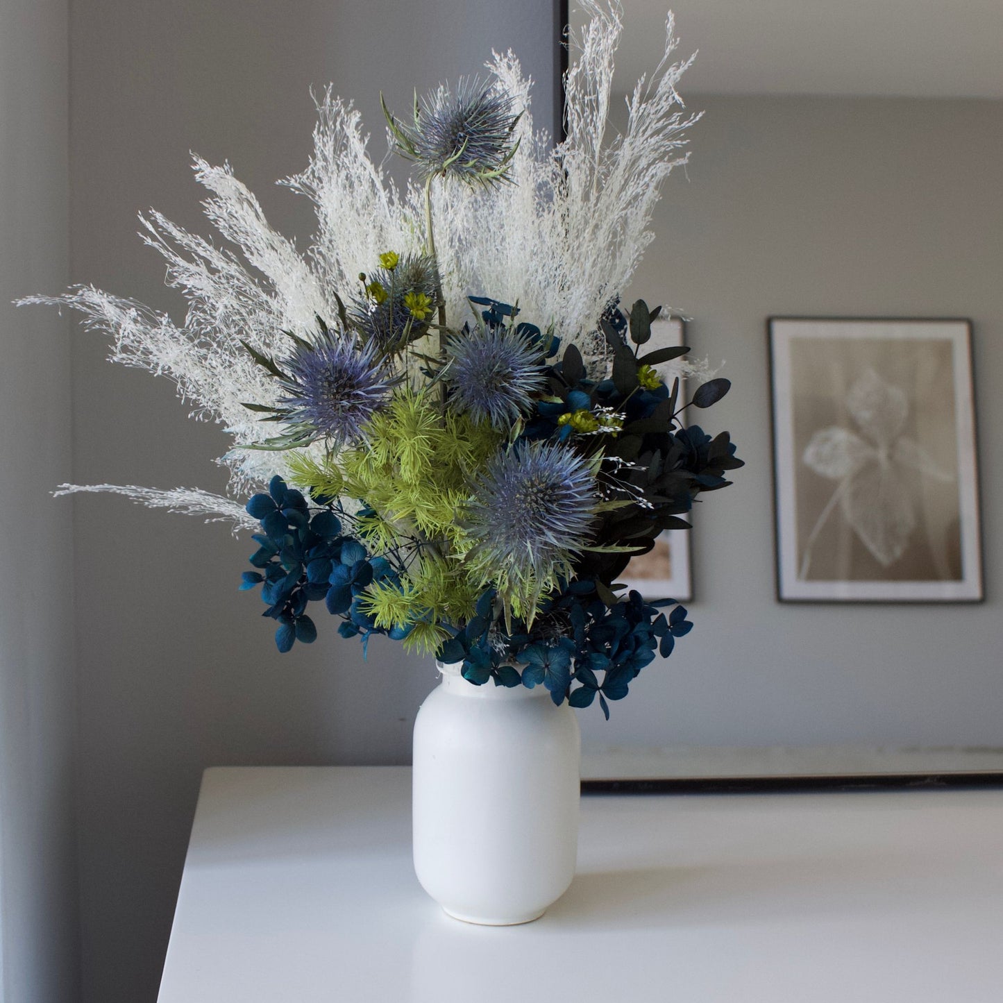 Channel the rugged spirit of the Scottish Highlands with an artfully preserved floral arrangement that embodies understated elegance. The Highlands showcases the captivating texture of blue thistles, the airy grace of natural grasses, and a rich palette of deep navy botanicals. Handcrafted from real flowers, The Highlands promises lasting appeal, requiring no water or upkeep for years to come. It’s the ideal, zero-maintenance statement piece for offices, studies, or any setting where sophisticated design is paramount. Lasts for 1 to 3+ years.