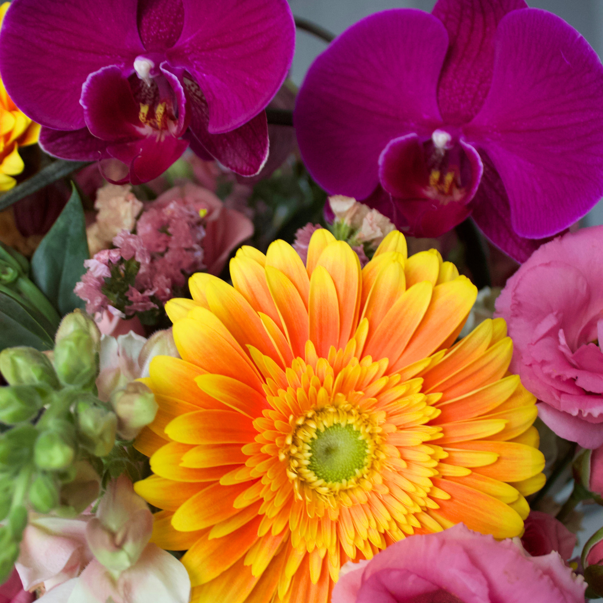 This striking bouquet features a cheerful dance of golden gerbera daisies, sculptural snapdragons, and deep magenta orchids, creating a rich tapestry of color that feels both sophisticated and welcoming. The pet-friendly blooms will vary based on seasonal availability.