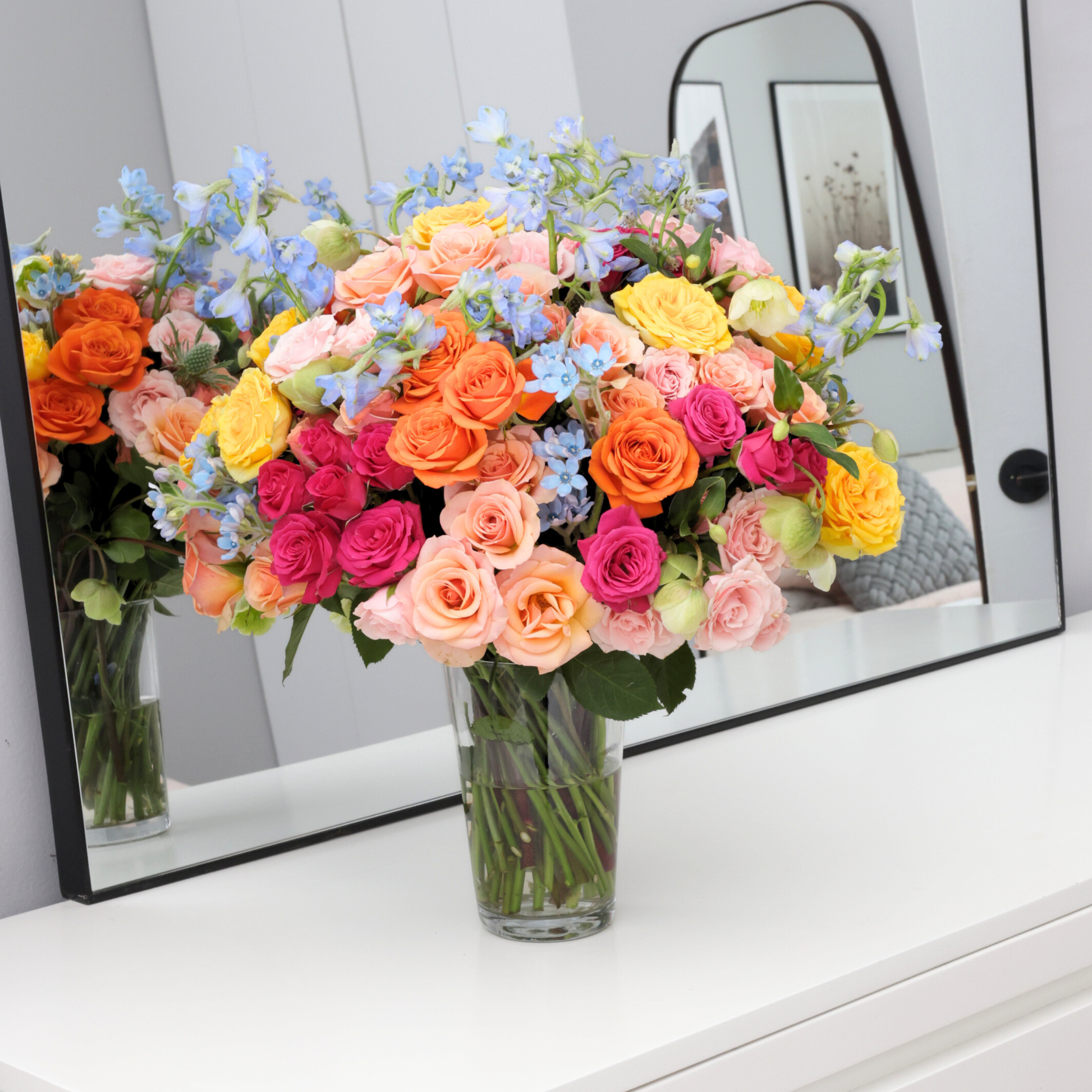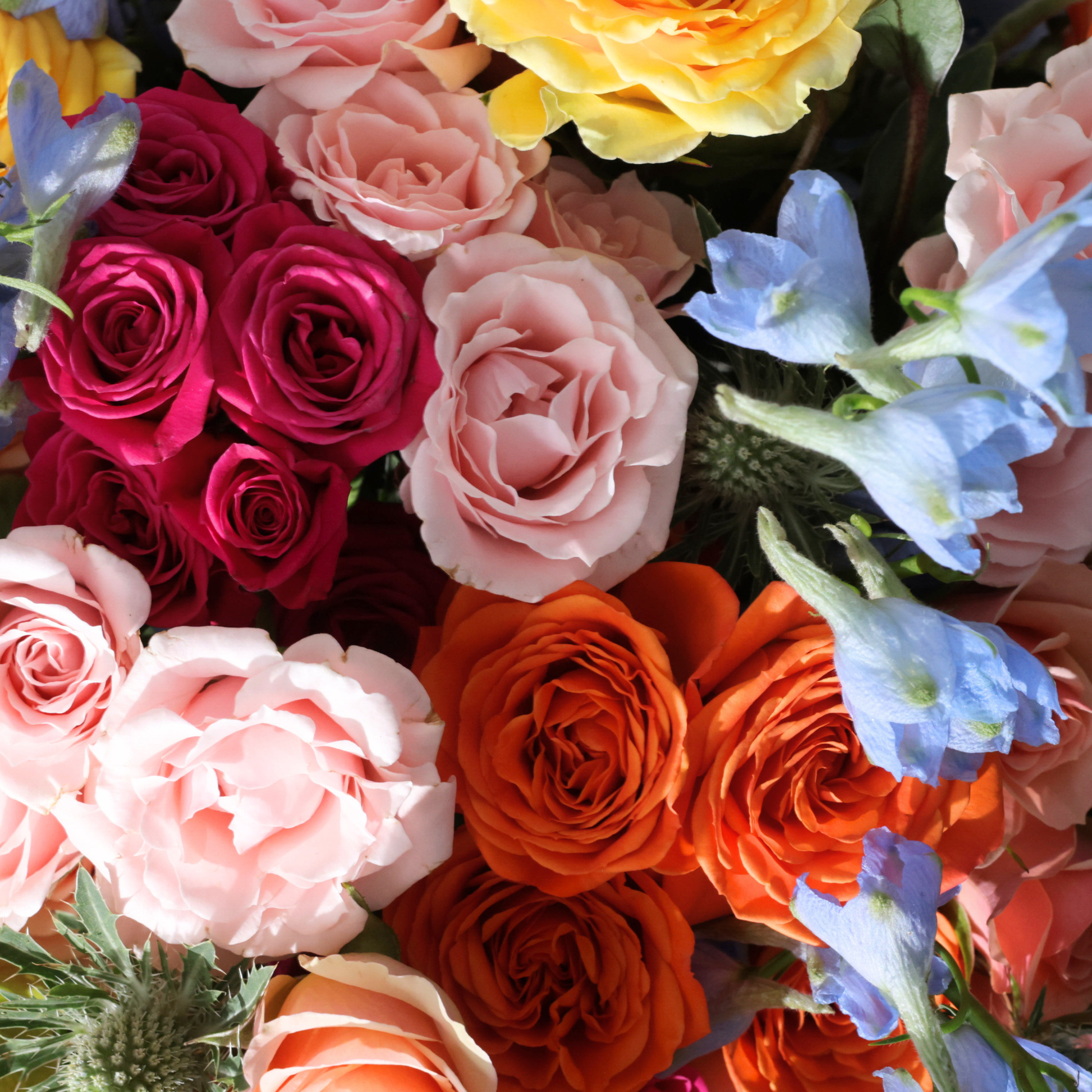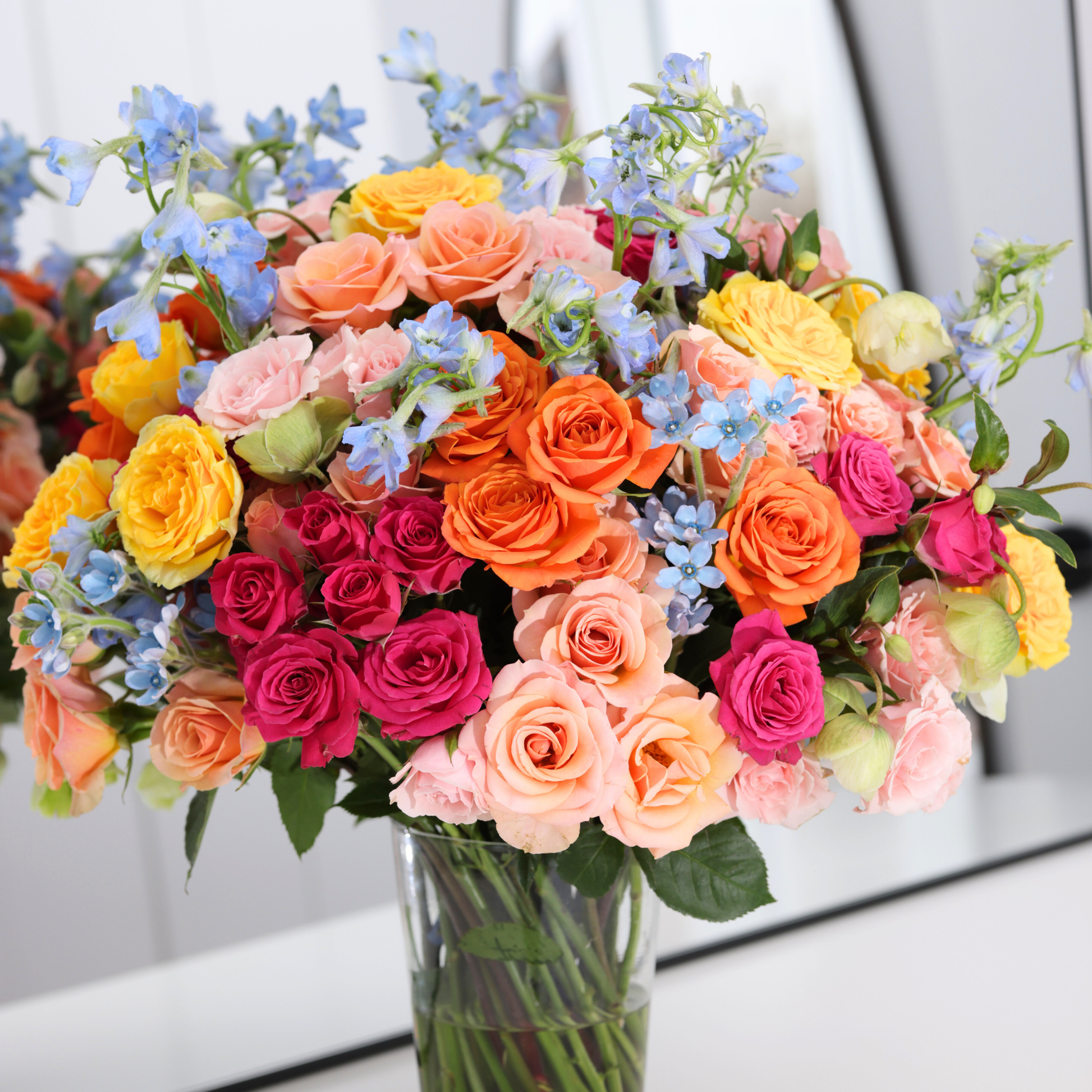 Inspired by the vibrant energy of a tropical escape, The Paradiso is a high-impact masterpiece. This lush arrangement features a sun-drenched palette of radiant yellow, bold orange, and electric pink roses, beautifully contrasted by wispy sprays of sky-blue delphinium and forget-me-nots. Artfully composed to feel both structured and celebratory, its dense texture and joyful colors capture the essence of the "Eternal Spring." It is a true statement piece of luxury, designed to bring joy and brilliance to your space.