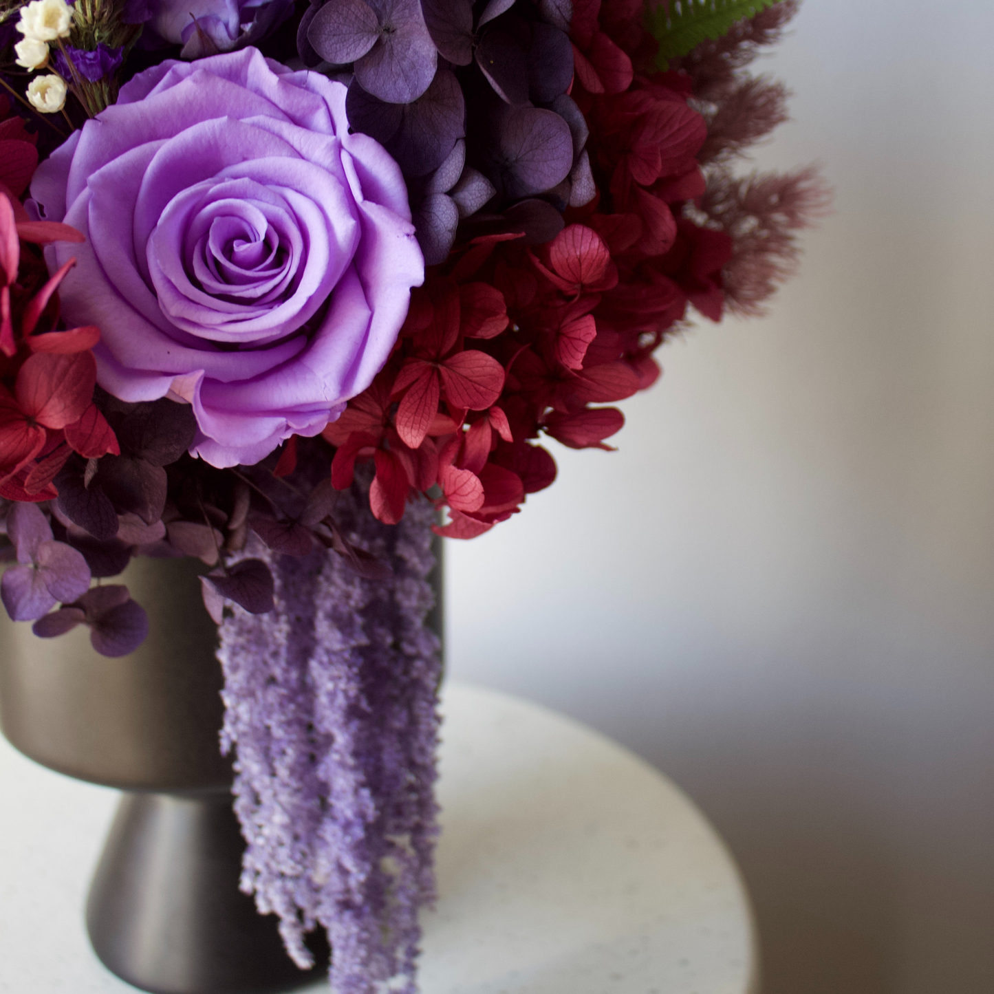 Introducing a breathtaking reimagining of our best-seller, Ultraviolet. This stunning, long-lasting arrangement features a luxurious blend of vibrant purples, from rich violet and amethyst roses to delicate lilac accents. Lush hydrangeas in deep berry tones provide striking contrast, while touches of preserved eucalyptus and unique flora enhance its dramatic appeal. A cascading element of delicate purple amaranthus adds an exquisite touch. This opulent and enduring masterpiece is designed to captivate. Lasts 1 to 3+ years.